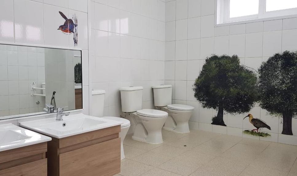 Nos contactó una de las arquitectas de la fundación que estaba a cargo de levantar una escuela rural en Puerto Montt con un encargo muy desafiante: Vestir un baño de azulejos blancos con nuestras ilustraciones de aves y árboles Pupila Nativa.